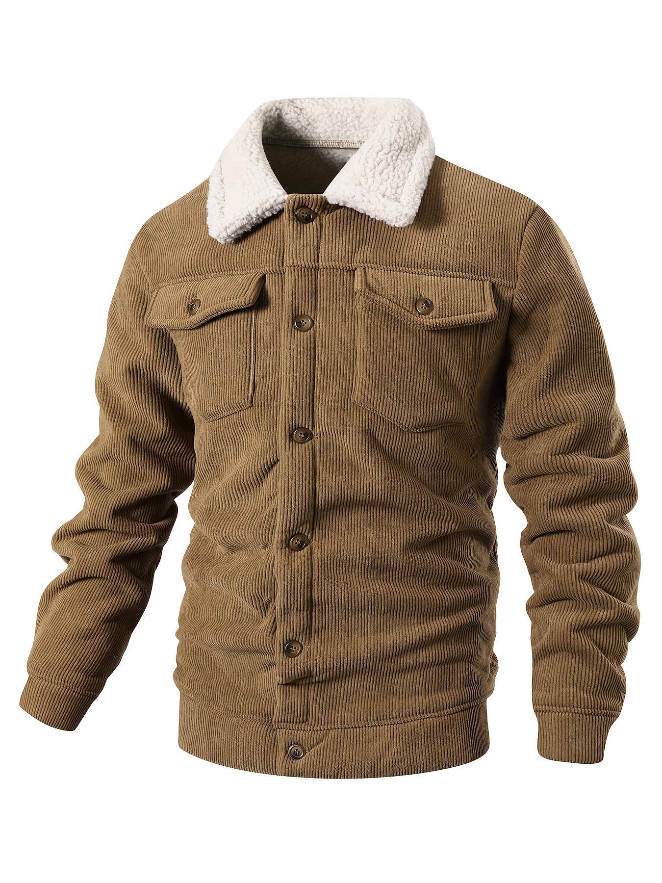 [Heavyweight Winter Jacket] Winter Heavyweight Men's Jacket | Corduroy Texture, Fleece Lining, Flip Collar, Double Pockets, Single-Button Closure, Machine Washable Polyester, Regular Fit Casual Outerwear