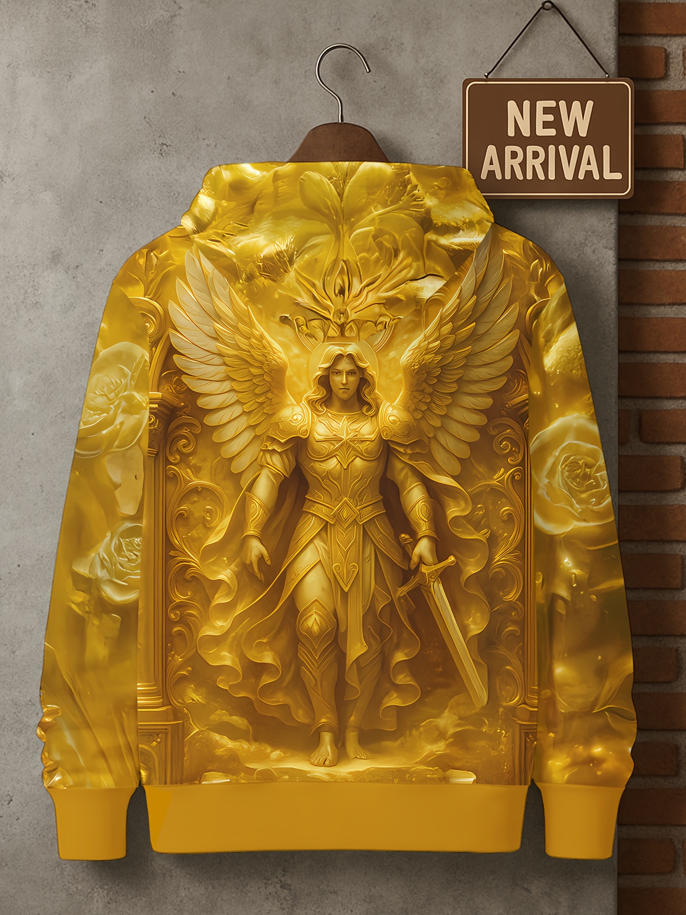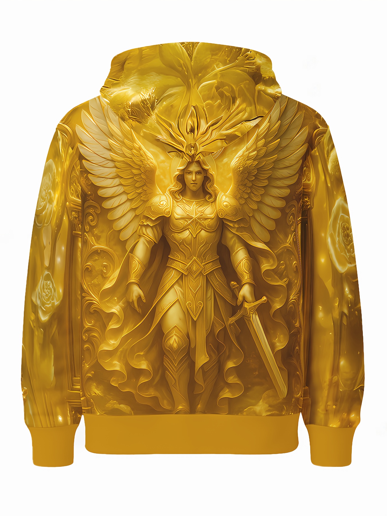 Men's 3D Printed Golden Winged Warrior Angel Hoodie - All-Over HD Graphic Mythology-Inspired Streetwear, Premium Comfortable Pullover with Hood, Casual Winter Wear & Fantasy Fashion, Machine Washable Regular Fit Sweatshirt