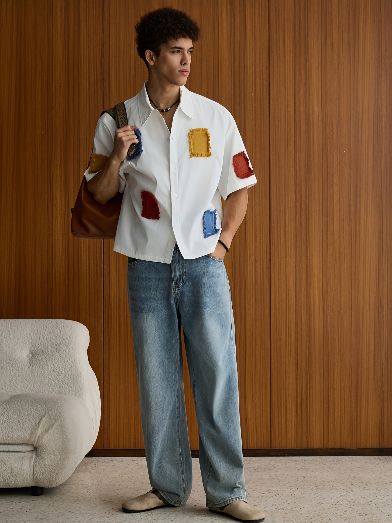 Men'S Summer Casual Color Block Patchwork Short Sleeve Shirt - Loose Fit, Button-Up Collared Blouse with Contrast Colorful Patches, Lightweight Non-Stretch Fabric for Casual Attire, Summer Casual Wear | Buttonup Shirt | Nonstretch Material
