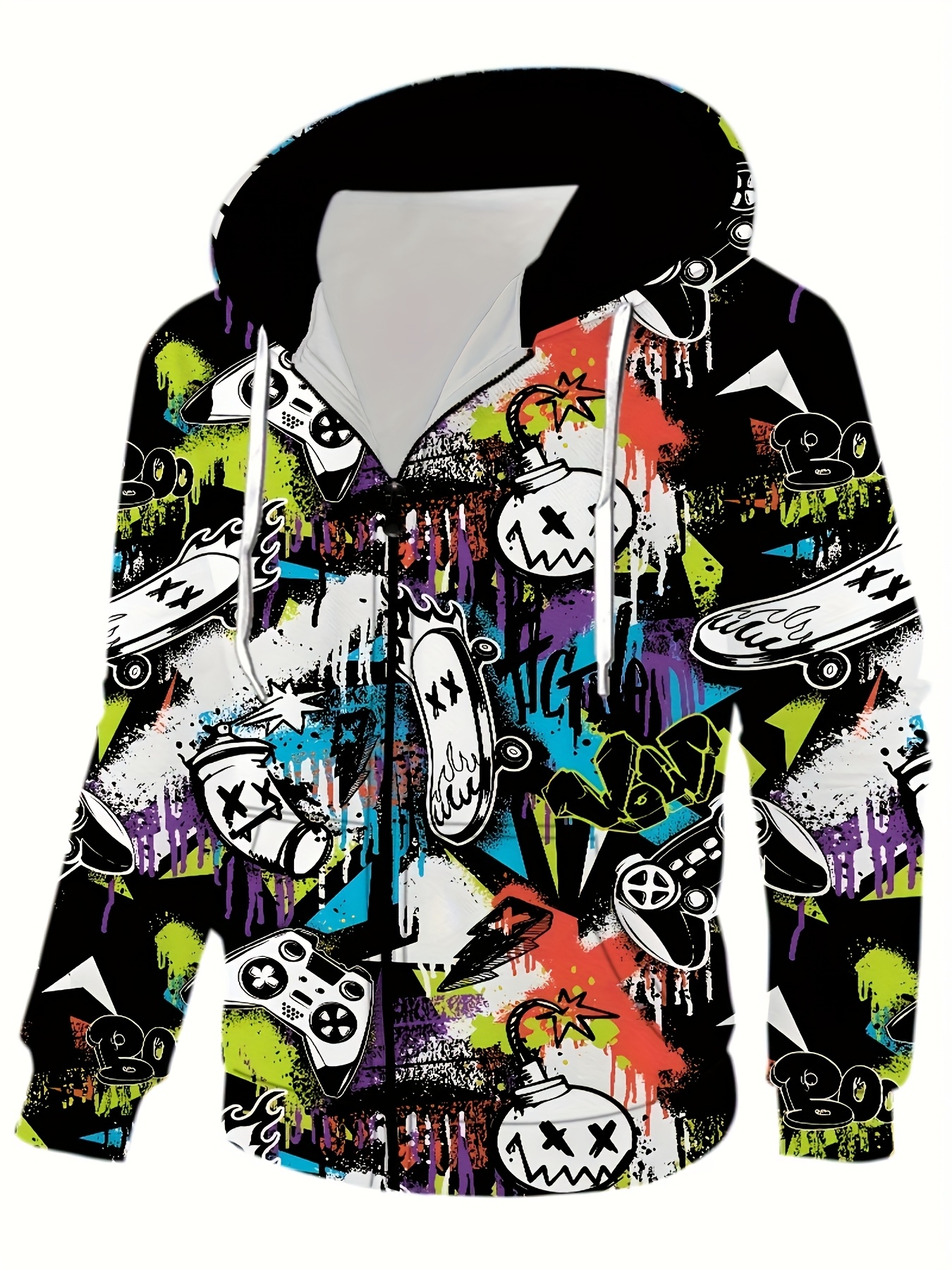 [1pc Men'S Novelty Hooded Jacket] 1pc Men'S Novelty Hooded Jacket, Casual Geometric Pattern Knit Polyester Fiber, Regular Fit Spring/Autumn Outerwear with Zip Closure