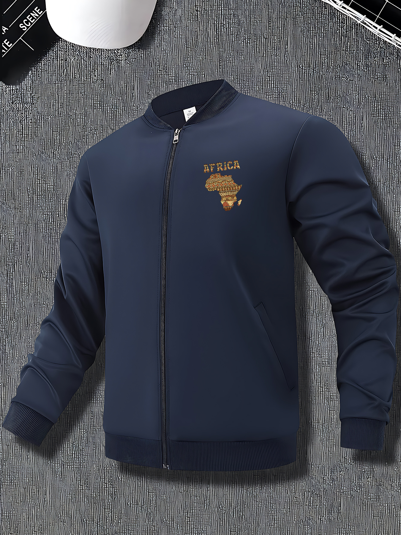 Men's African Tribal Art Print Slim-Fit Bomber Jacket - Black Zip-Up Stand Collar Streetwear Coat with Pockets, Machine Washable Polyester for Autumn/Winter Casual Wear, Sleek Knit Texture