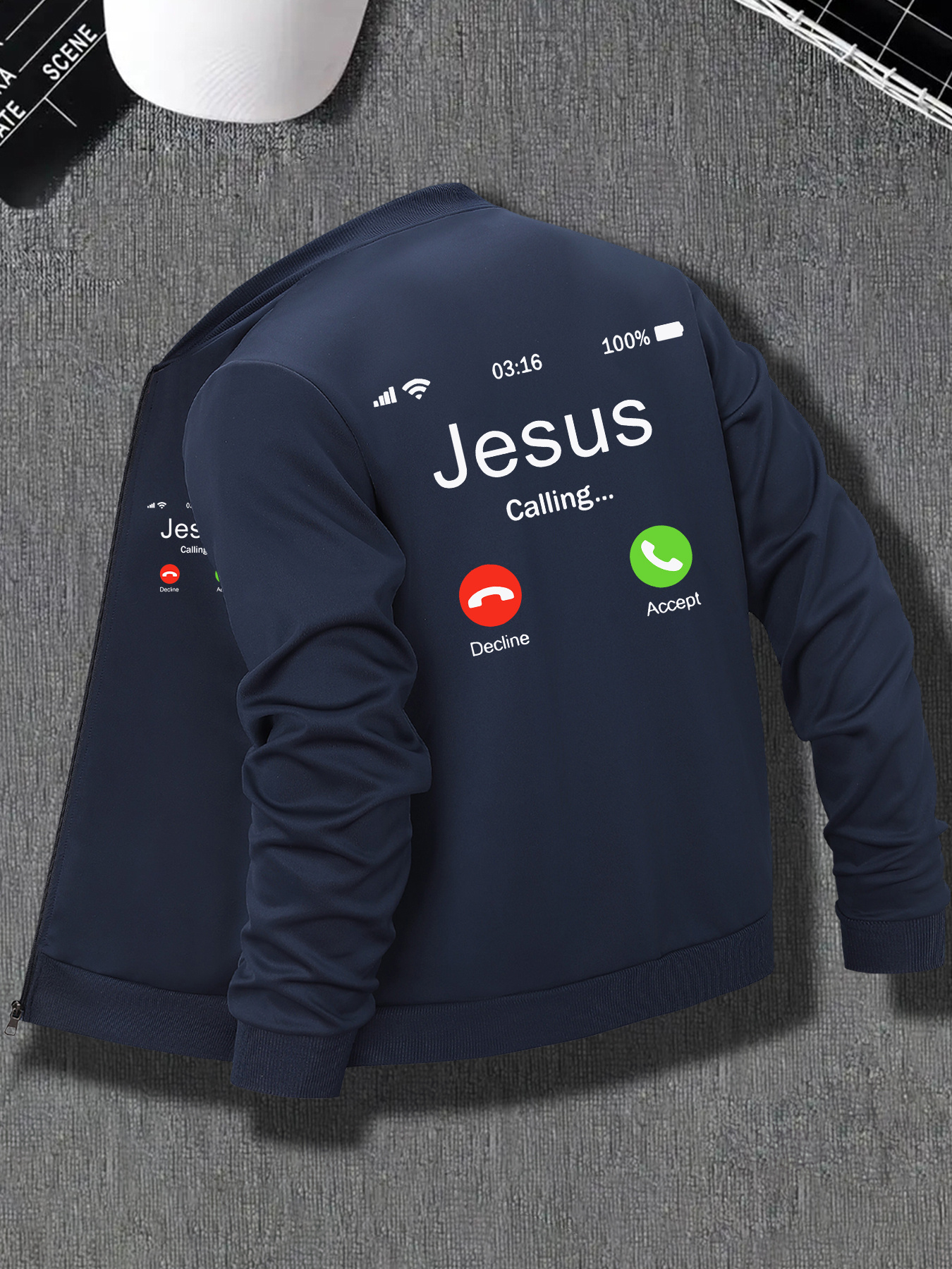 Men's Casual Zip-Up Jacket with Stand Collar - "Jesus Calling" Graphic, Lightweight Polyester Blend, Perfect for Spring & Fall, Machine Washable