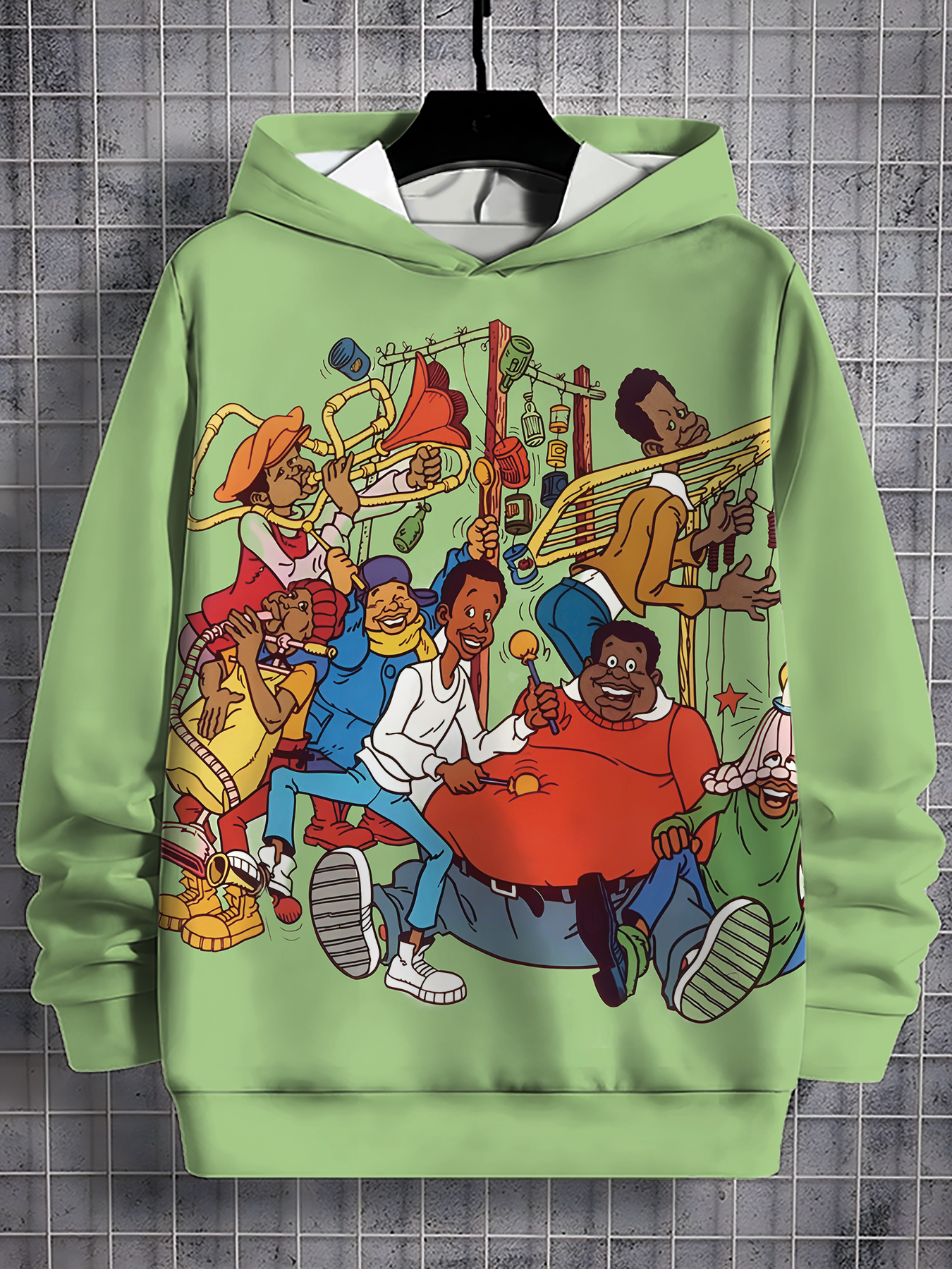 Lime Green Men's 3D Funny Cartoon Graphic Hooded Sweatshirt with Music Band & Retro TV Print, Soft Warm Pullover for Autumn Winter Casual Wear, Machine Washable Digital Hoodie for Themed Parties & Everyday Outfits