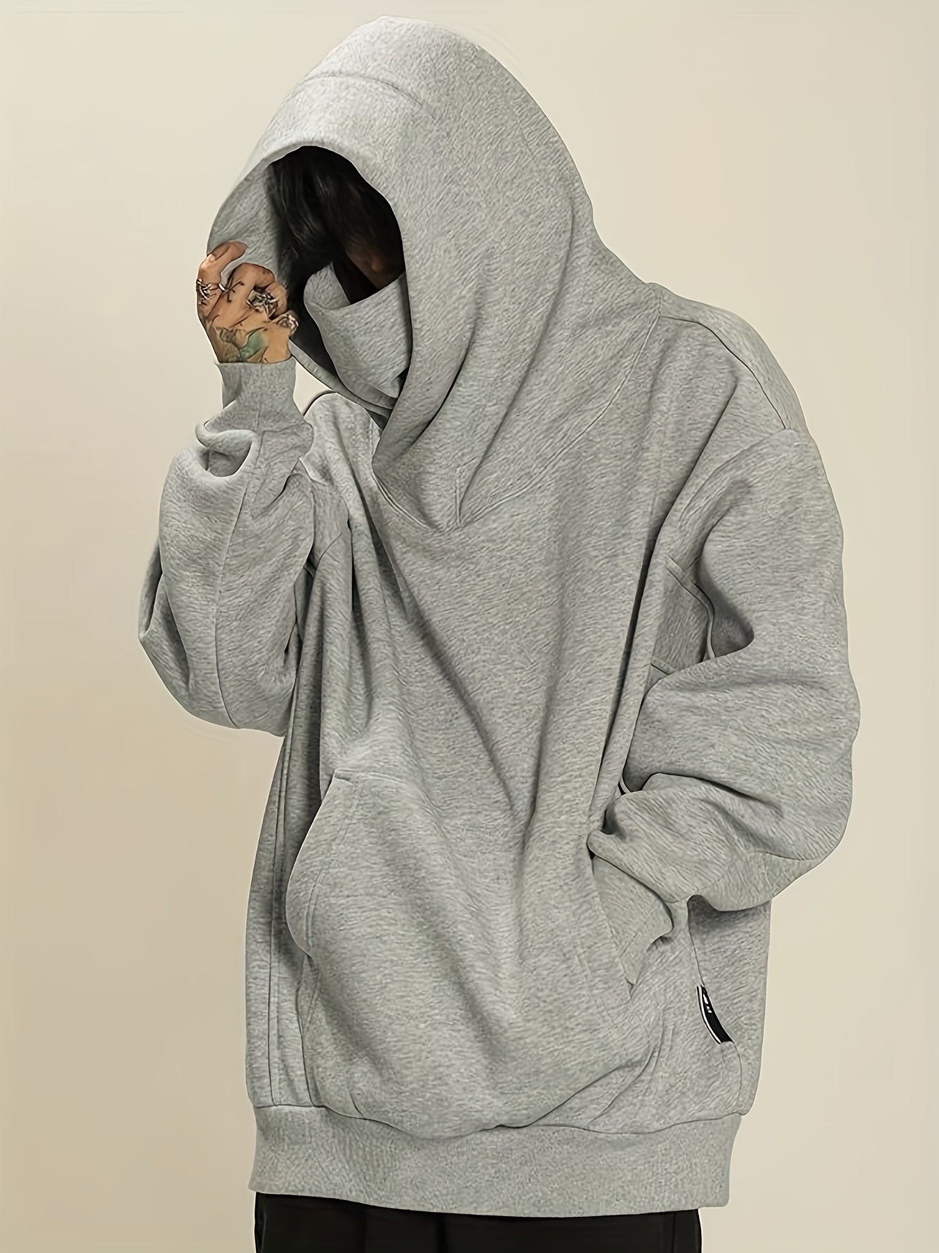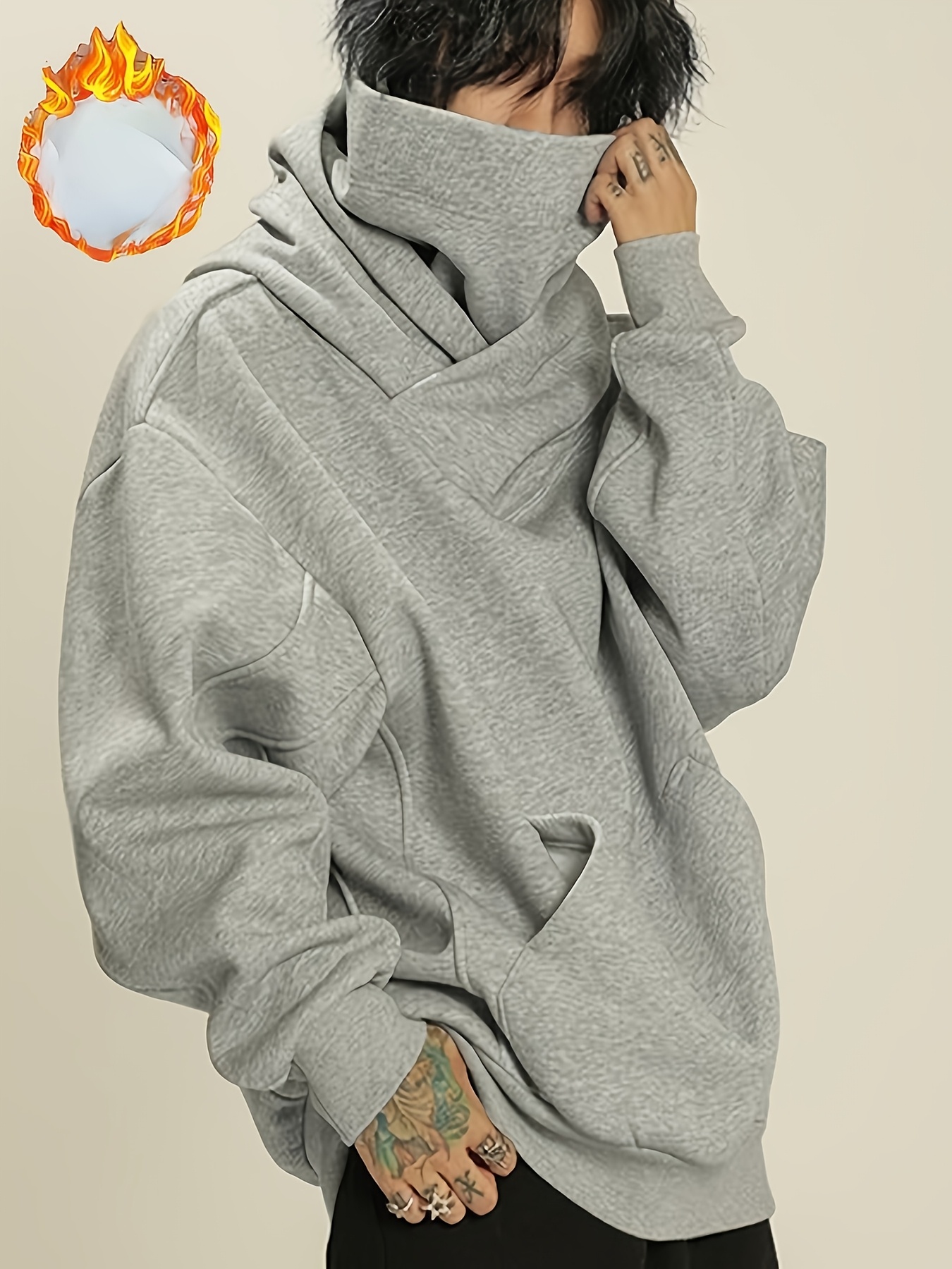 Men's Fleece-Lined Hooded Sweatshirt - High Neck Pullover with Pockets, Loose Fit Casual Winter Warmth, Machine Washable Grey All-Season Top for Daily & Leisure Wear, Sweater Hoodie