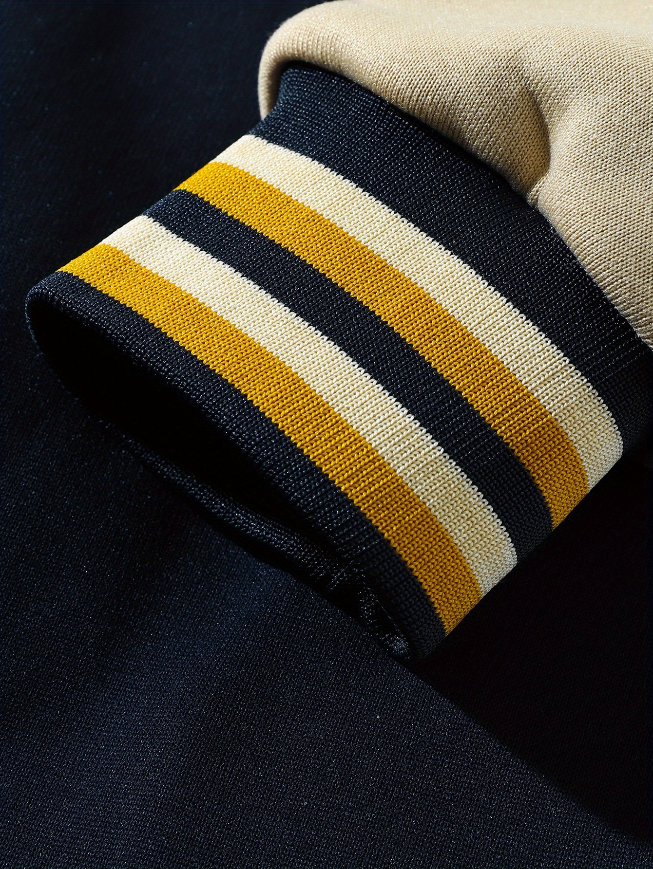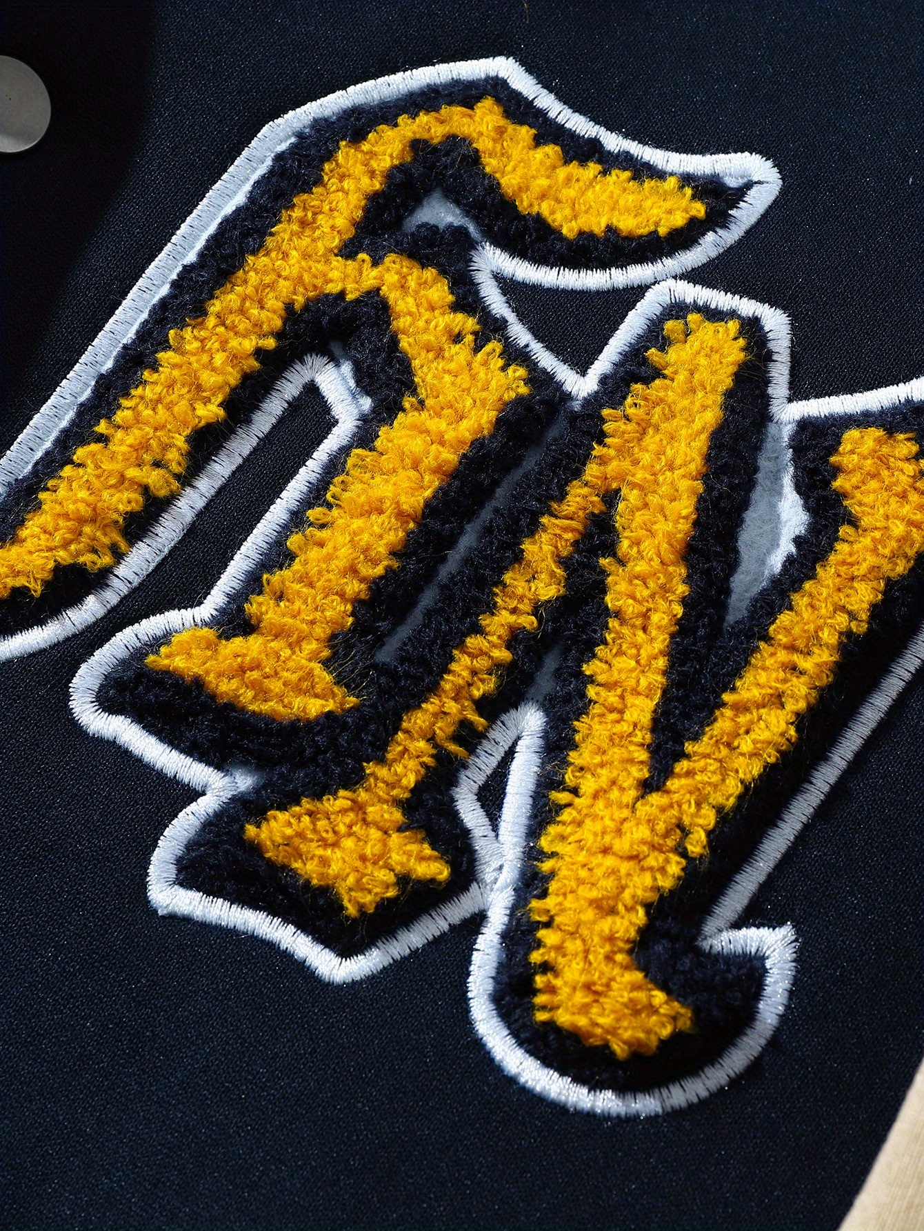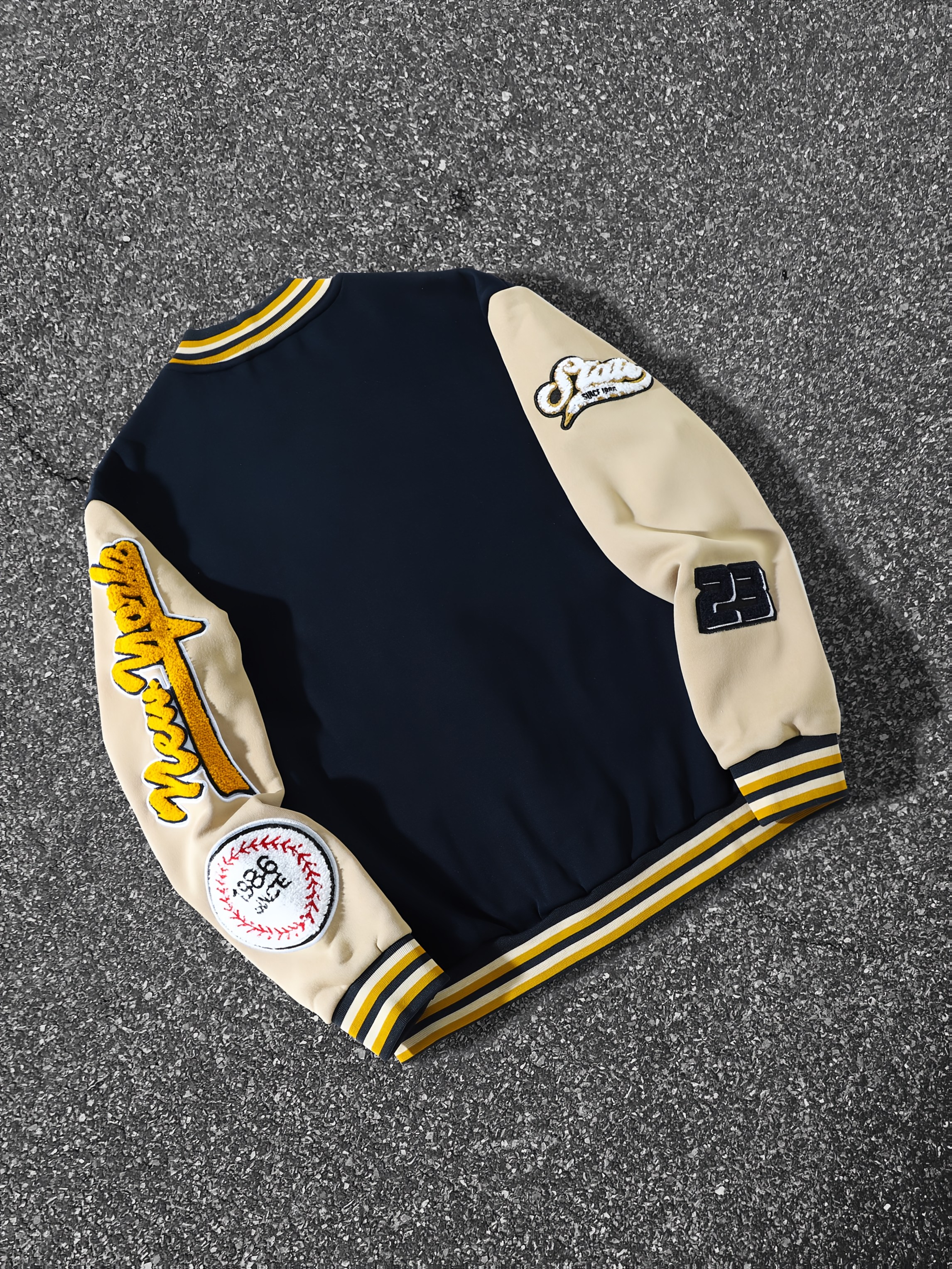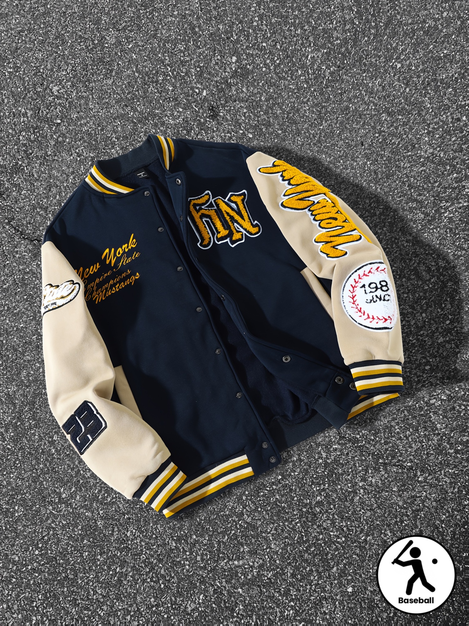 Men'S Navy Blue & White Patchwork Baseball Jacket - NY Logo & Letter Print, Snap Closure, Long Sleeve, Regular Fit with Pockets for Casual Streetwear, Baseball Jacket, Durable Fabric