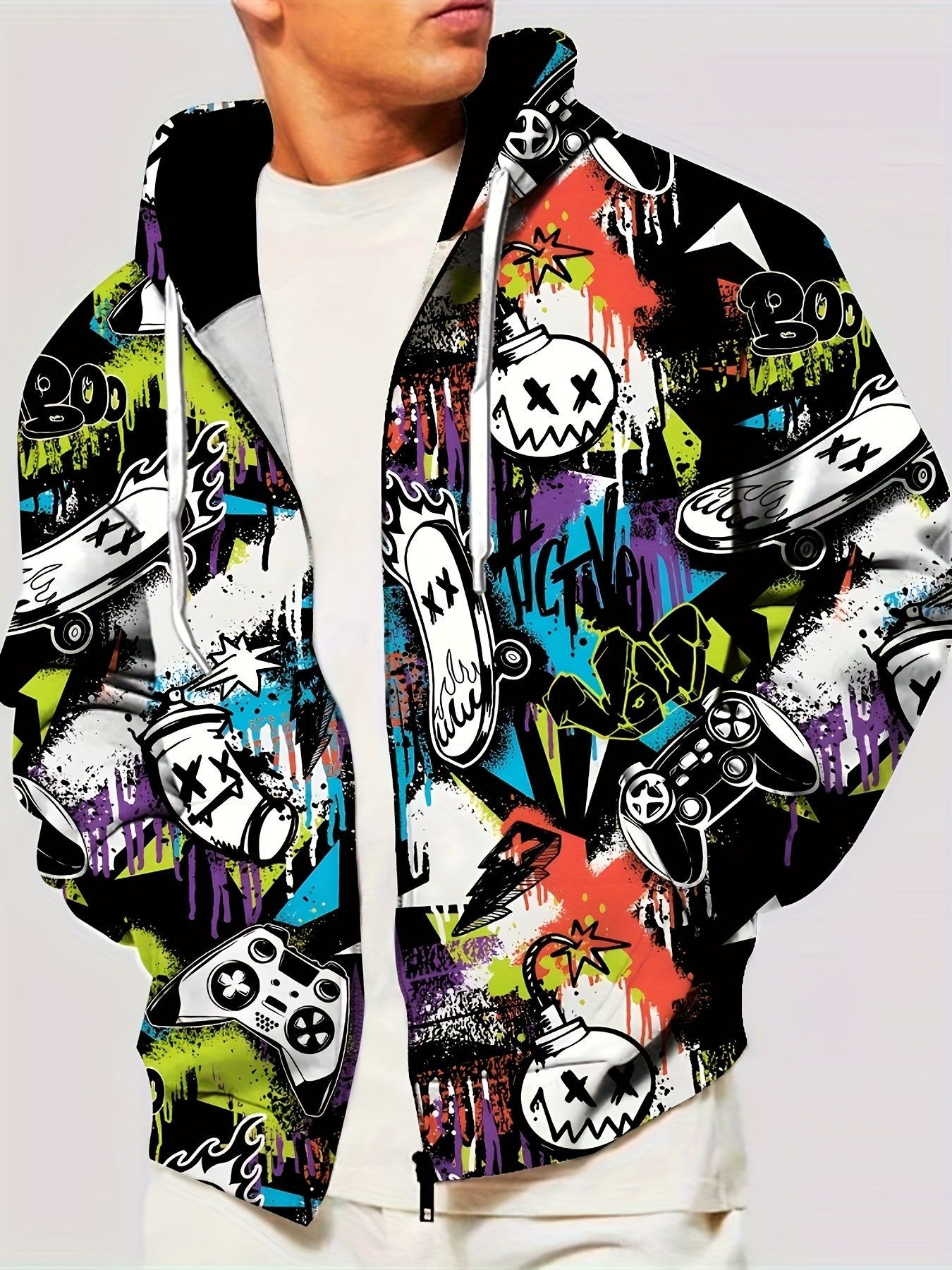 [1pc Men'S Novelty Hooded Jacket] 1pc Men'S Novelty Hooded Jacket, Casual Geometric Pattern Knit Polyester Fiber, Regular Fit Spring/Autumn Outerwear with Zip Closure