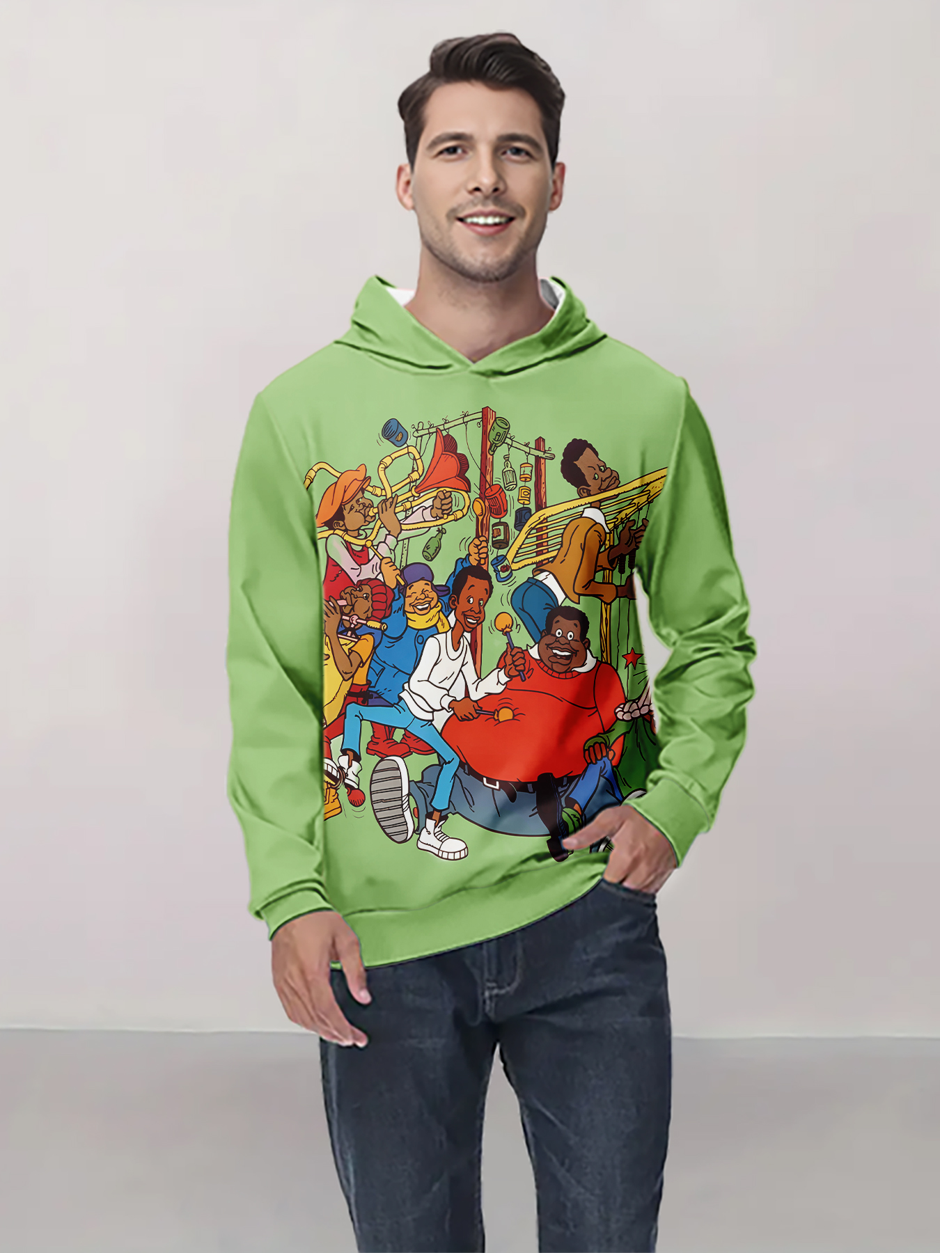 Lime Green Men's 3D Funny Cartoon Graphic Hooded Sweatshirt with Music Band & Retro TV Print, Soft Warm Pullover for Autumn Winter Casual Wear, Machine Washable Digital Hoodie for Themed Parties & Everyday Outfits