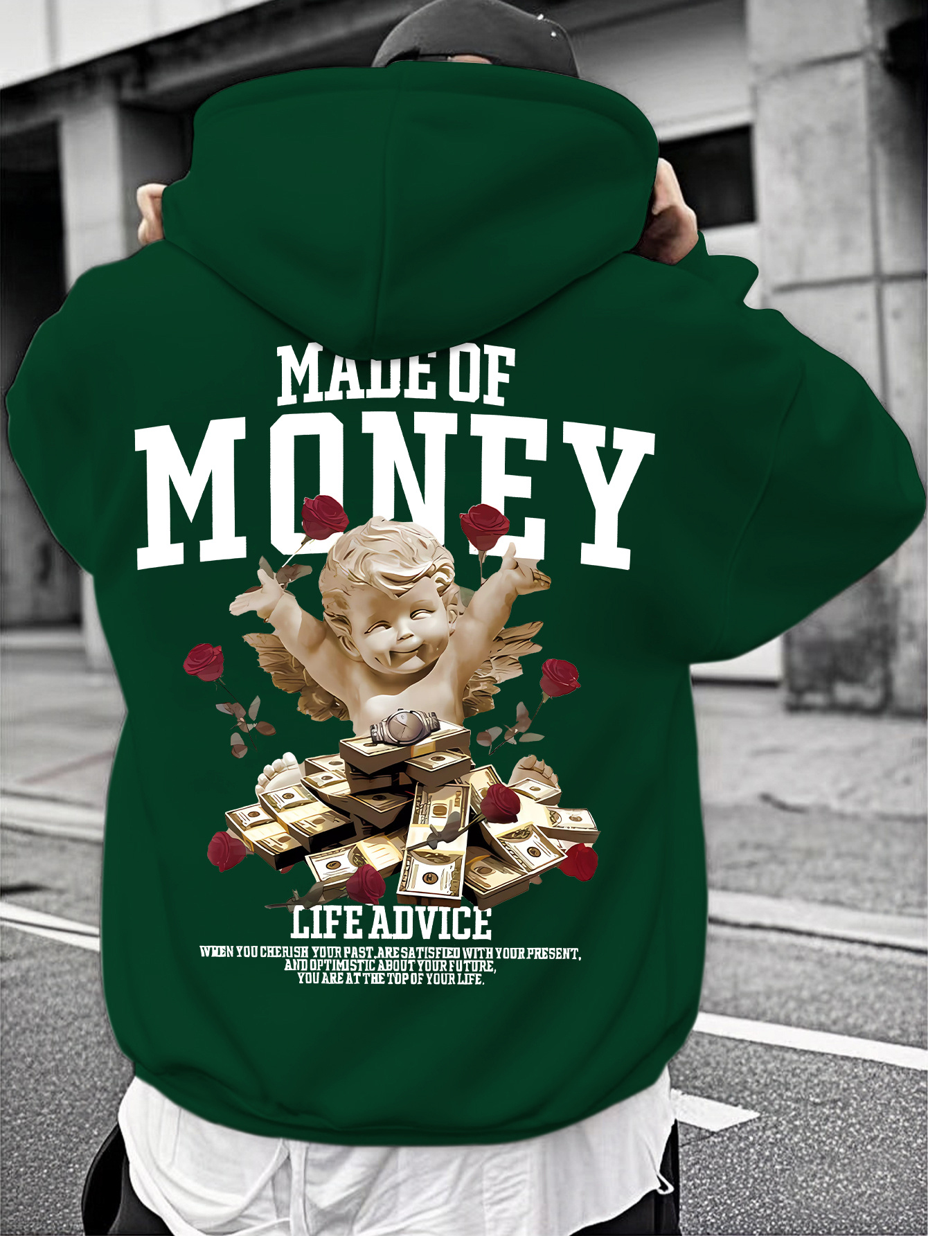 [Trendy Red Hoodie] Trendy Men's Red Hoodie with "MADE OF MONEY" Print | Angel & Money Design, Casual Winter Pullover, Long Sleeves, Front Pocket, Sweater Hoodie