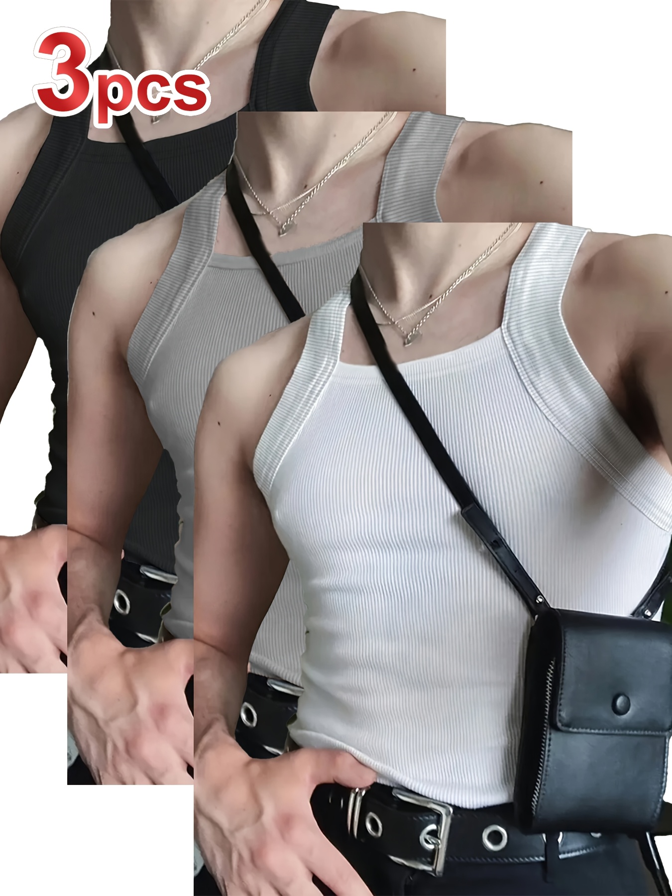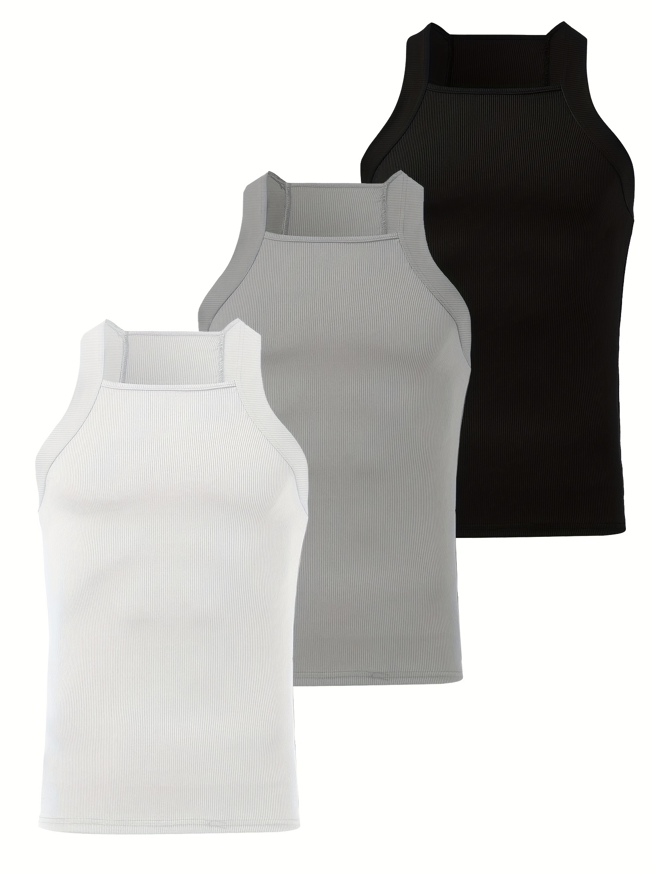 3-Pack Men's Sexy Slim-Fit Stretch Tank Tops - Sleeveless Off-Shoulder/Boat Neck Summer Muscle Tops, Medium-Stretch Fabric, Hand Wash Only, Black/Grey/White, Summer Tank Tops